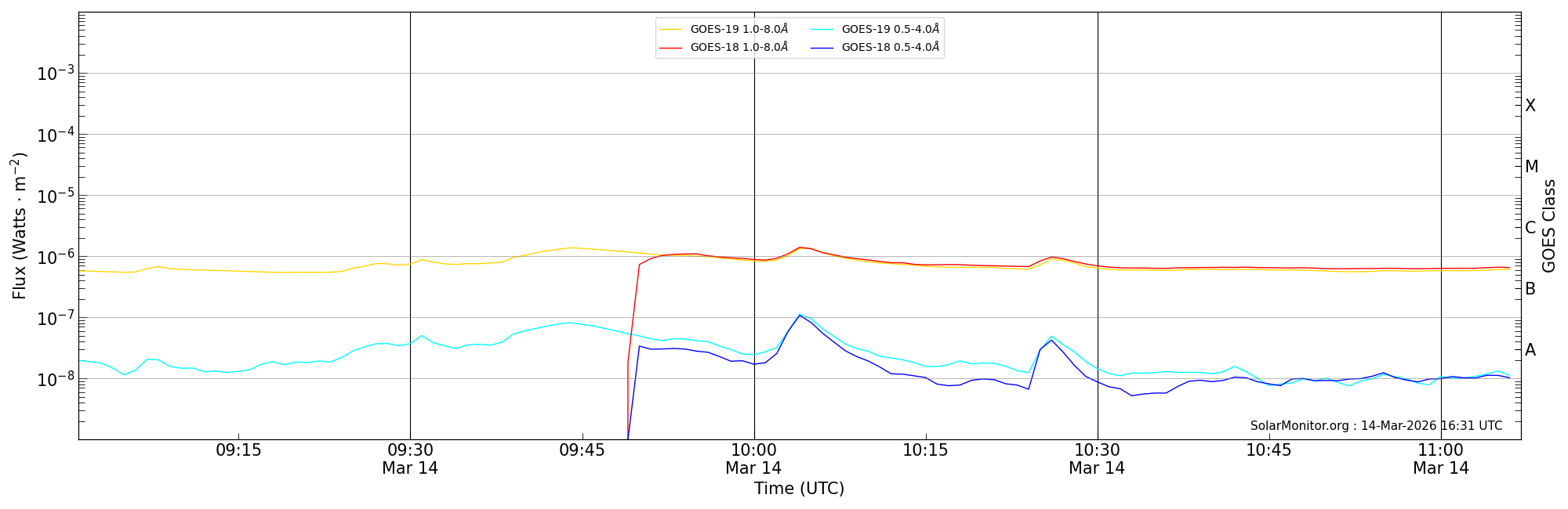| 2026-03-14T10:01:00 | 10:05:00 | 10:07:00 | 9, 88 | 14384 | C1.3 | HEK : SSW Latest Events |