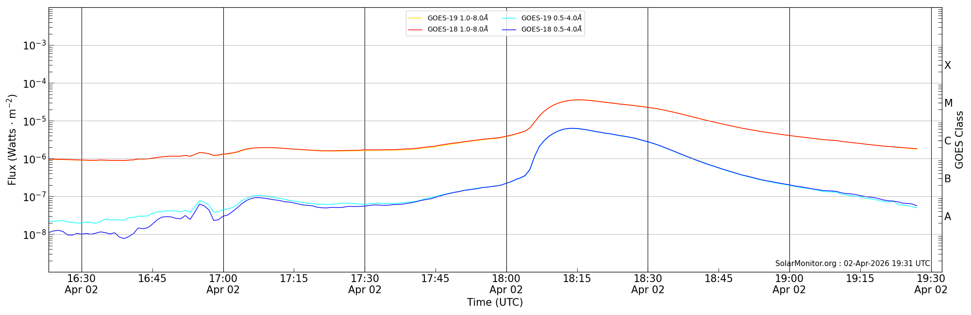 | 2026-04-02T17:23:00 | 18:15:00 | 18:32:18 | 12, 18 | 14404 | M3.5 | HEK : SSW Latest Events |