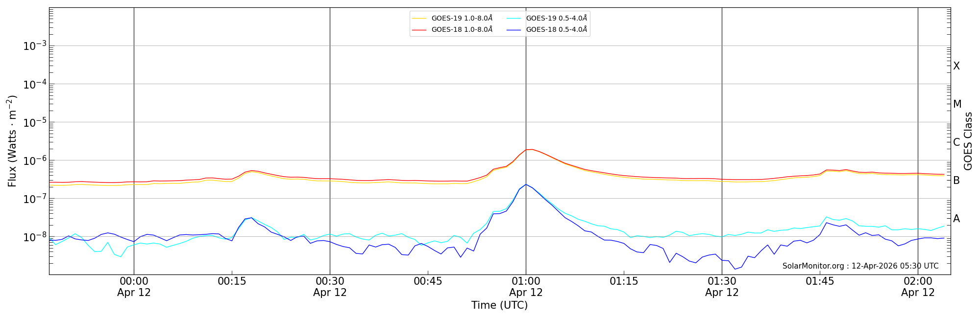 | 2026-04-12T00:47:00 | 01:01:00 | 01:05:00 | -8, 75 | None | C1.9 | HEK : SSW Latest Events |