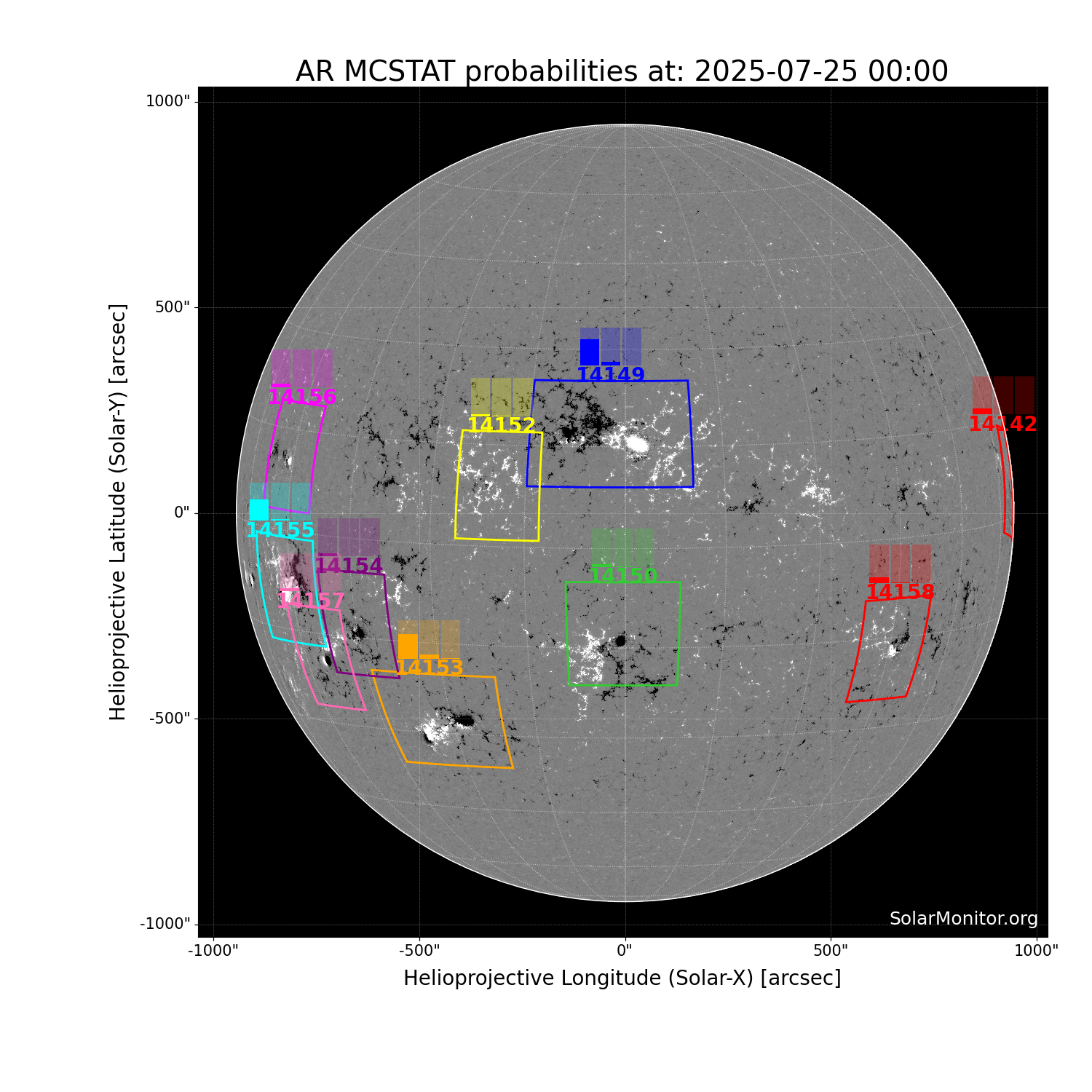 SolarMonitor's flare prediction system's probabilities are calculated using the NOAA Space Weather Predicion Centre's McIntosh classifications. There are two methods, MCSTAT and MCEVOL, that use sunspot-group McIntosh classifications and Poisson statistics to calculate flaring probabilities valid for a 24-hr period starting at 00:00 UTC. The flaring probabilities are calculated using historical data from solar cycles 23 and 24 (1996-2019).